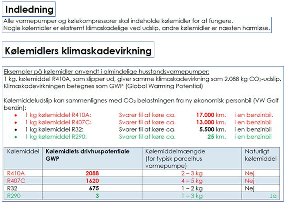 Forbrugerrådet anviser også alternative varmepumper, der har naturlige kølemidler (f.eks. R290 med GWP = 3).